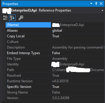 Specific Version标志被设置为True以供参考。这意味着程序试图解析到正在引用的程序集的Major.Minor.Patch.Build版本。