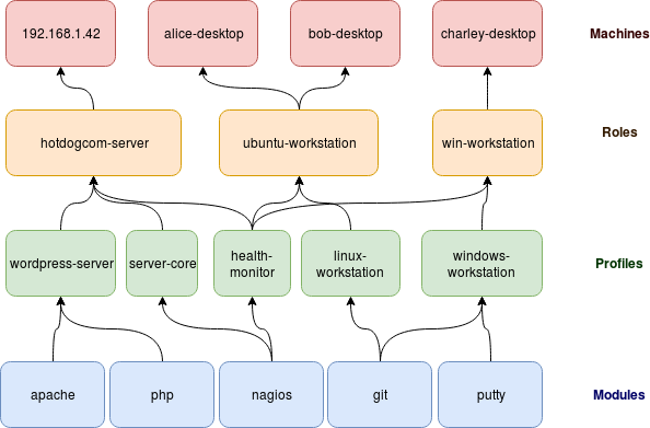 我对木偶很陌生,我正在努力弄清楚如何组织模块、配置文件和角色。我对模块配置文件角色模式的一般理解是,每个服务器都有一个角色,角色是从概要文件构建的,而配置文件是从模块构建的。下面是我为帮助我可视化而做的一个粗略的图表: