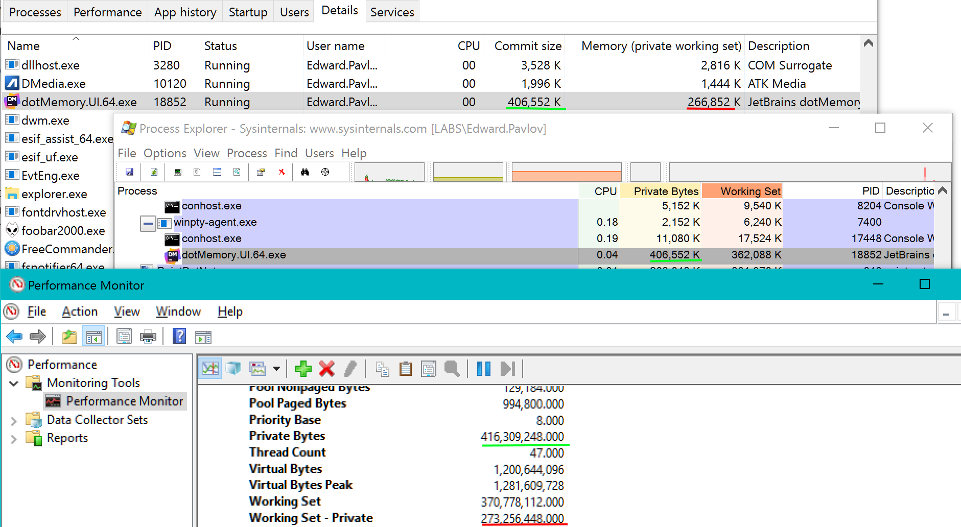 默认Windows任务管理器显示“专用工作集”。它在"Windows任务管理器“和Perfmon窗口的附带屏幕截图上高亮显示红色。您可以启用“提交大小”列并查看“私有字节”。它在"Windows任务管理器“、Perfmon和"Sysinternals”上以绿色突出显示。dotMemory (不是dotTrace btw)将“私有字节”显示为“总计”内存消耗。