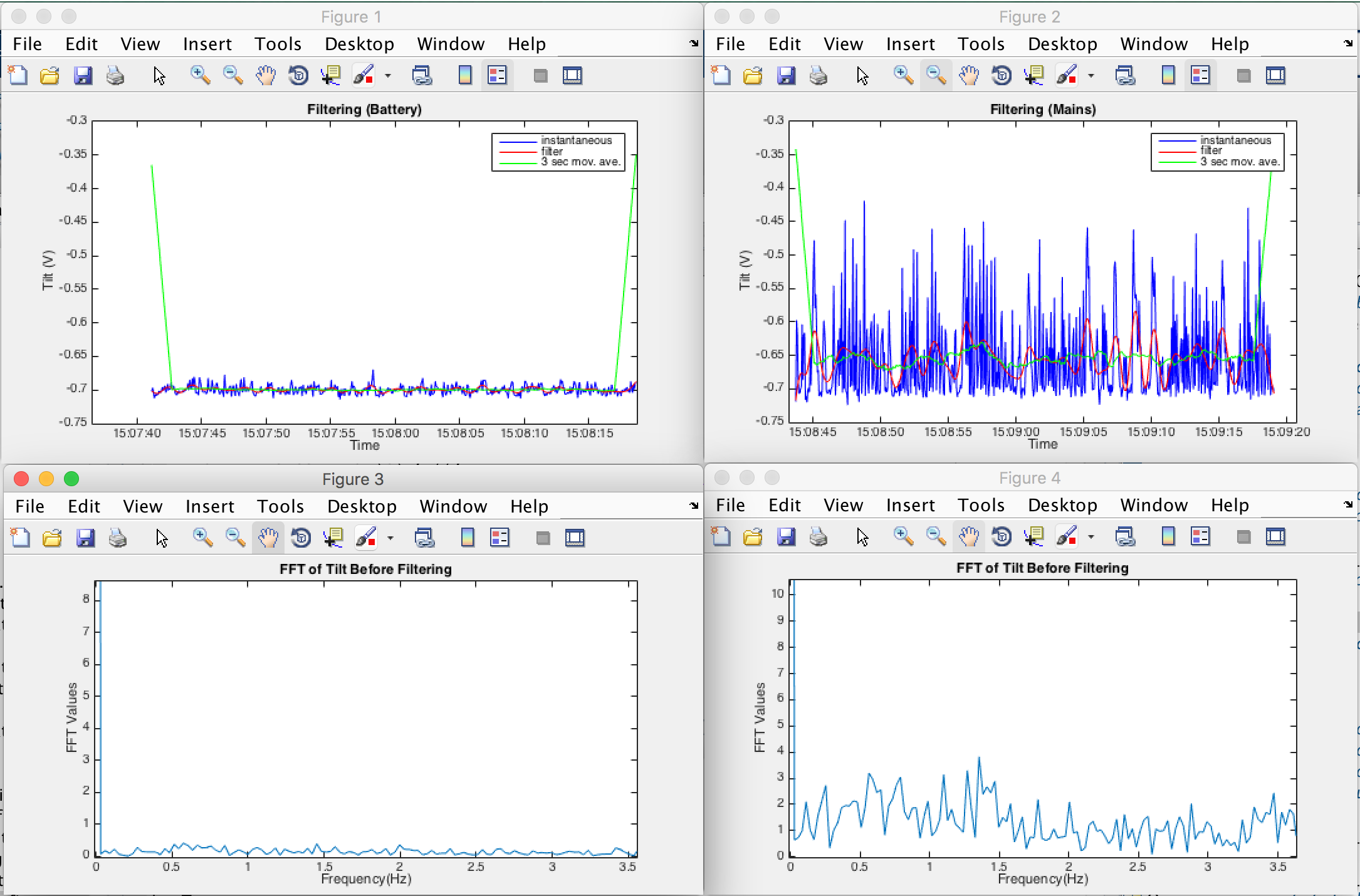 背景:--我的问题是,当倾斜仪由电池供电时,噪声似乎是对称的,并且变化约为平均值,因此滤波将测量值返回到很好的精度。然而,当我用电源供电时,数据的噪音更大,不规则性更强,变化更大,并且产生不对称尖峰。因此,使用移动平均值和滤波器往往会给出一个远离实际测量值的值。