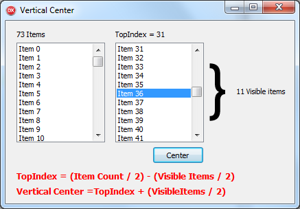 ListBox1.TopIndex := Index - (VisibleItems div 2);