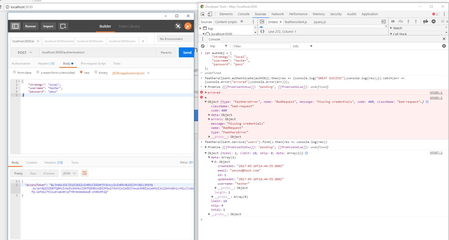 .configure(feathers.authentication({ storage: window.localStorage }));这是一个屏幕截图,显示了铬调试器和邮递员中的一些请求。