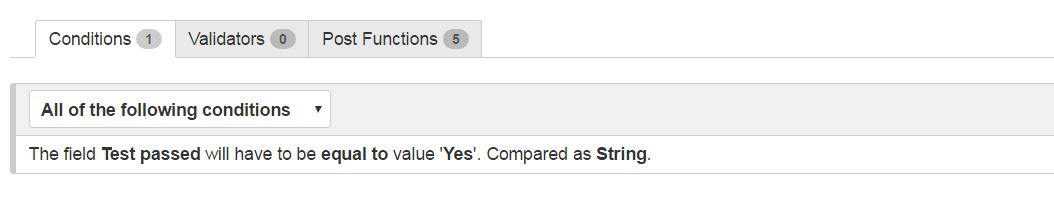我目前正在JIRA中创建一个工作流,它将帮助我的团队更好地执行测试。由于我们主要致力于Web开发,当涉及到测试时,我希望在IE9、IE10和IE11中进行测试,然后才能将其标记为通过。我尝试通过进入一种状态和一种转换的多个转换来做到这一点,并且尝试添加一个屏幕来允许开发人员/测试人员检查哪个版本的IE已经过测试。