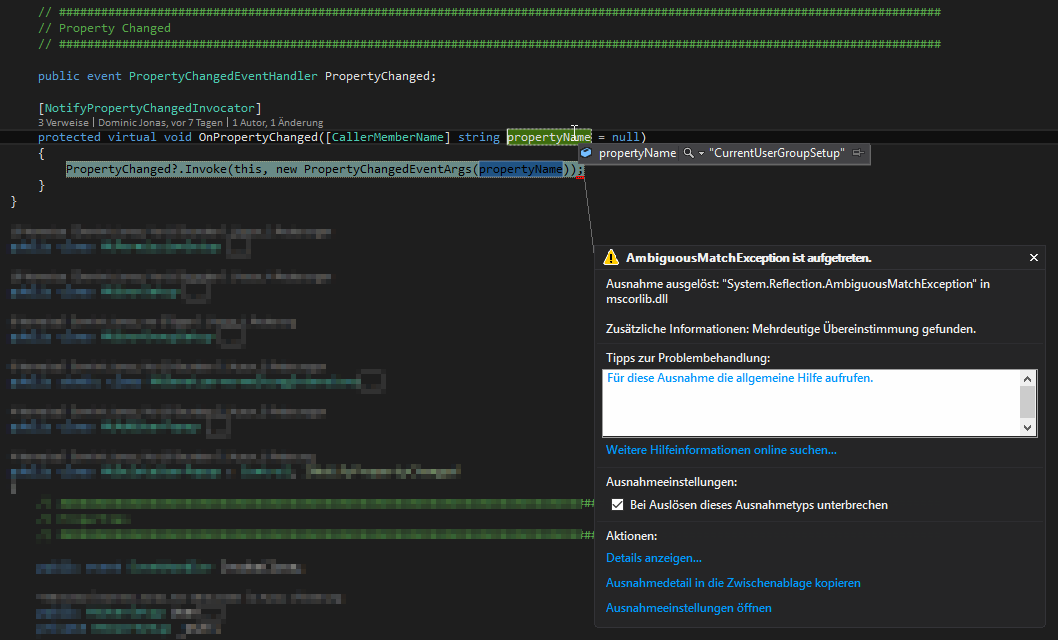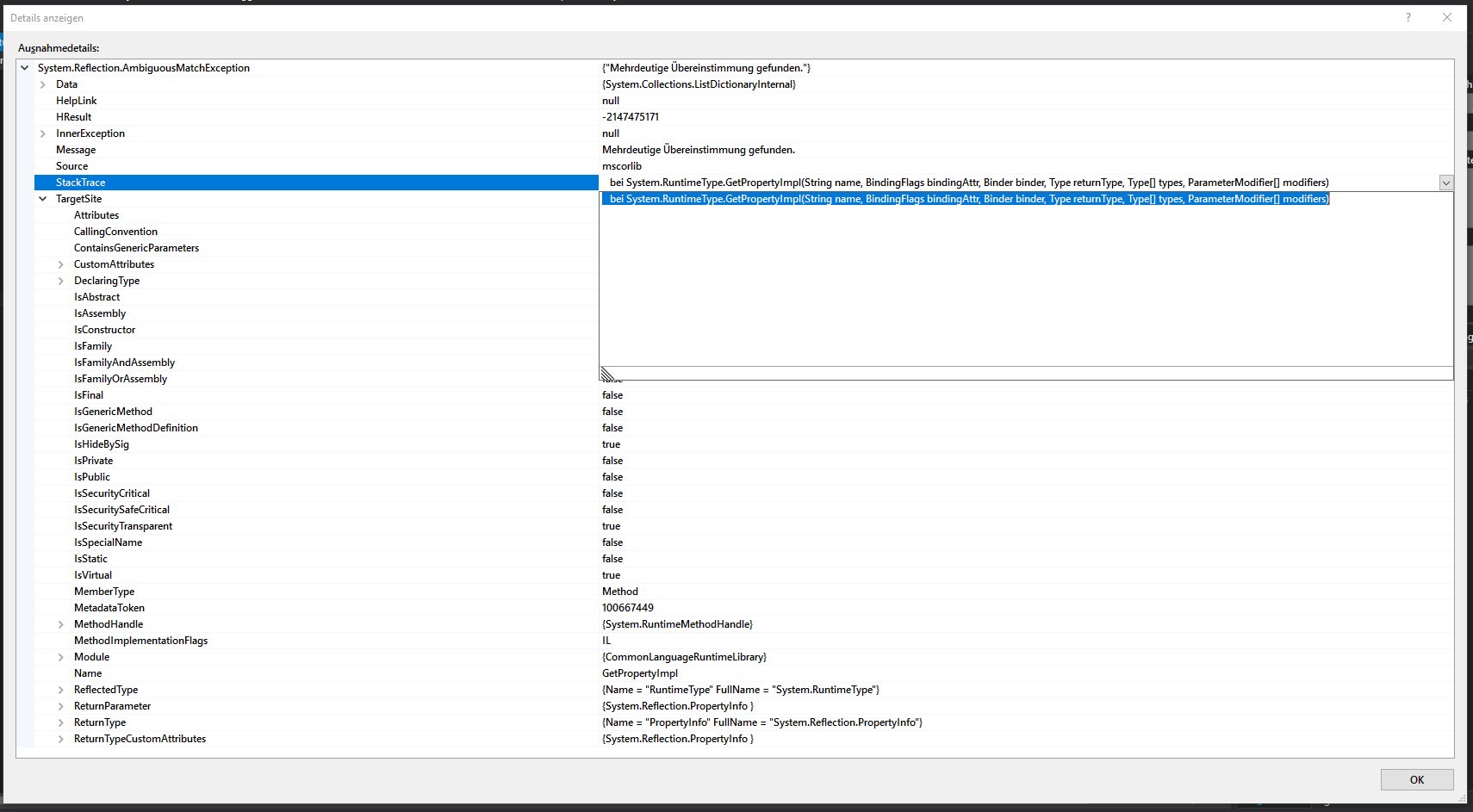 System.Reflection.AmbiguousMatchException ist aufgetreten. HResult=-2147475171 Message=Mehrdeutige bereinstimmung gefunden. Source=mscorlib StackTrace: bei System.RuntimeType.GetPropertyImpl(String name,BindingFlags bindingAttr,Binder binder,Type returnType,Type[] Type,ParameterModifier[]修饰符) InnerException: