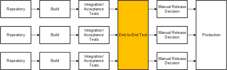 我们增加了一个共享的端到端阶段,部署了所有三个微服务,并对它们进行端到端测试。每当其中一条管道达到这个阶段,它就会进行部署和测试。信号量确保管道通过一个接一个的阶段。故障使三条管道全部停止。