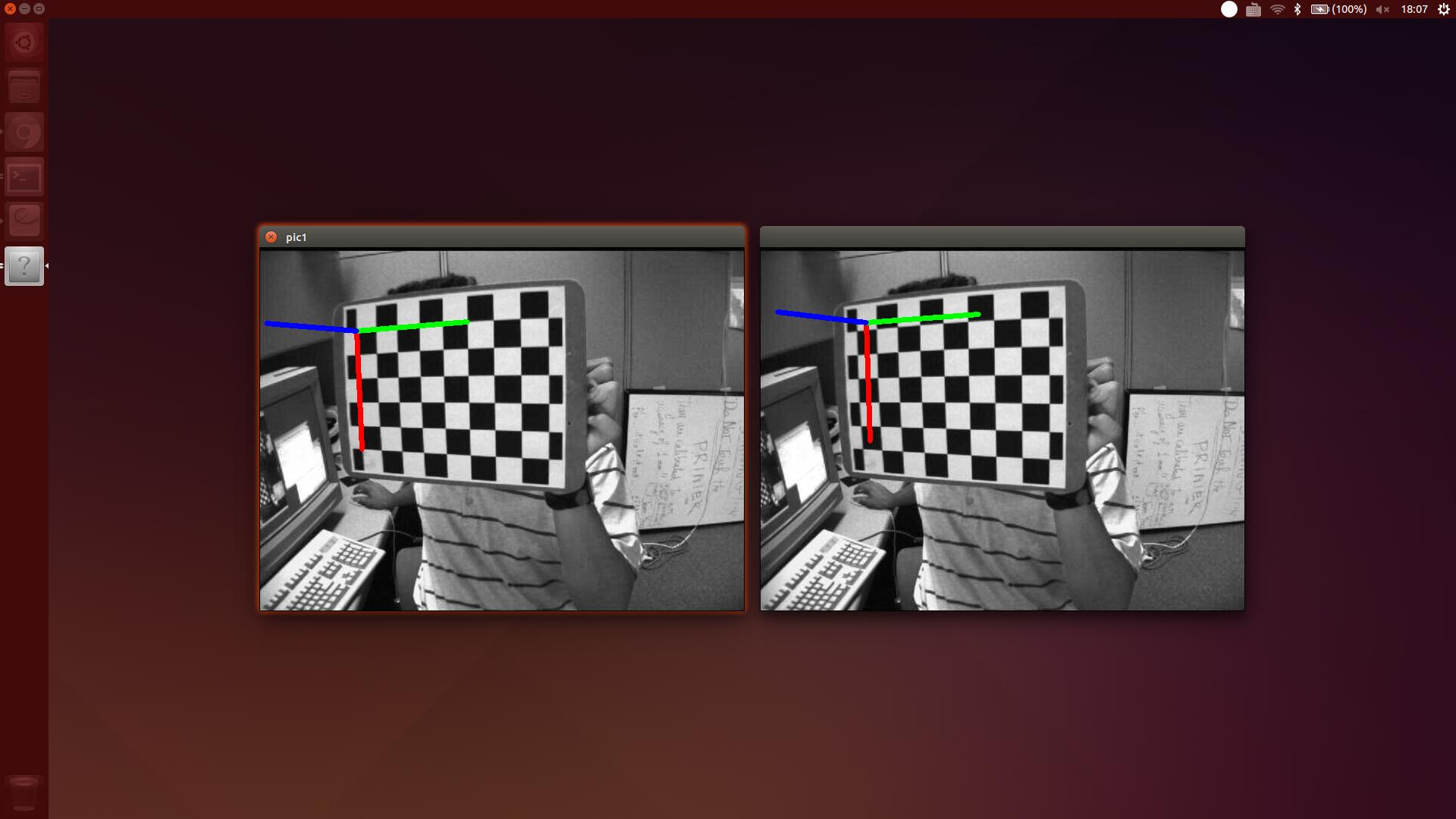 所以我用cam1和cam2拍了一张棋盘的照片,马克作为pic1,pic2.I用cv::solvePnP().And得到了cam1的外部参数,我用pic1中的cv::projectPoints()绘制了cam1的世界坐标系。