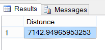 select geography::Point(25.3132666, 55.2994054 ,4326).STDistance(geography::Point(25.25434, 55.32820,4326)) as Distance返回