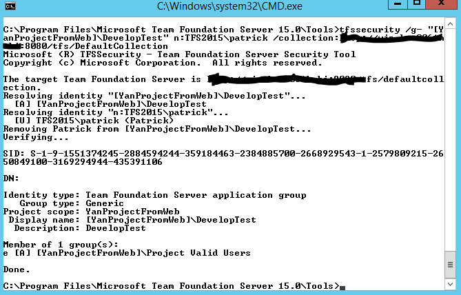 tfssecurity /g- "[TeamProject]\Developers" <domain>\<username> /collection:http://tfsserver:8080/tfs/collection/我得到: