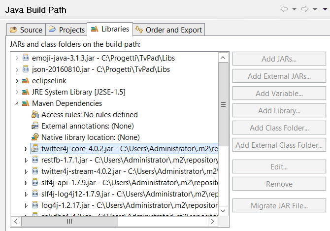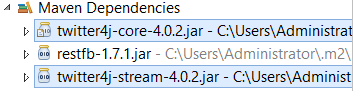 我有一个应用程序,它使用Twitter4j来流Twitter数据。在Maven依赖项中,我获得了4.0.2版本,但我想更新到4.0.4。我该怎么做?在配置构建路径中,无法编辑jar文件的选择。