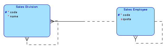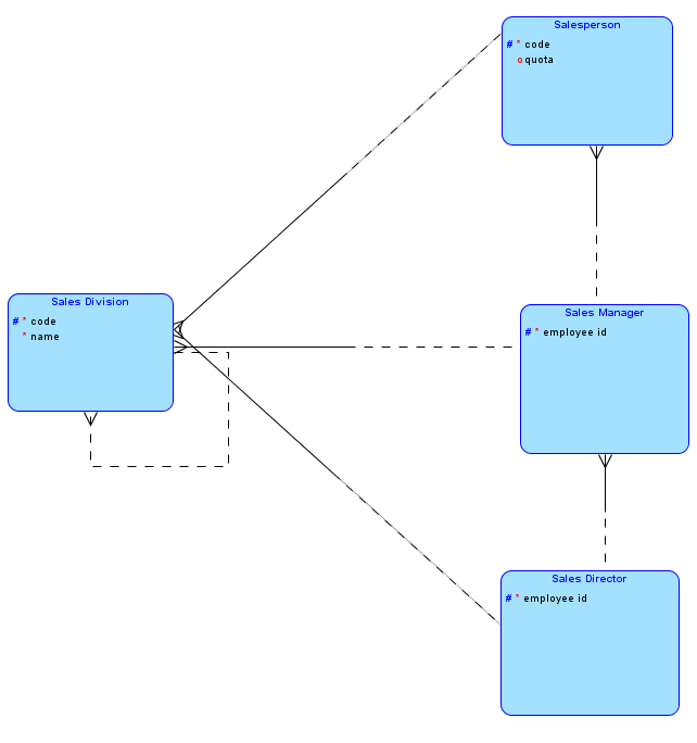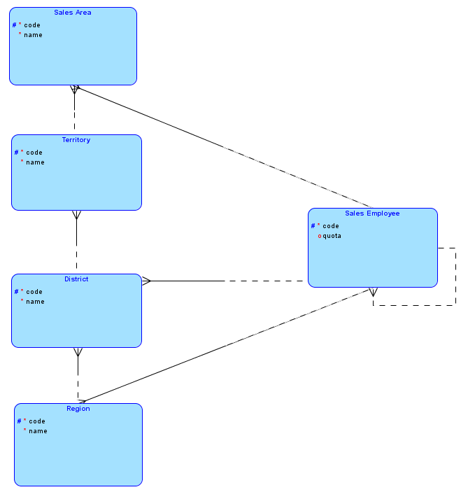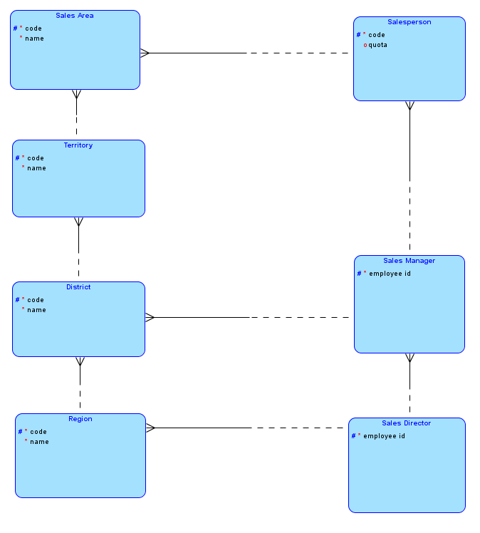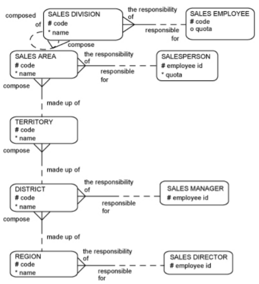 我认为将SALES_DIVISION和SALES_ENTITY表示为单一层次实体的模型是错误的。这在逻辑上是相似的,但我们已经失去了业务规则。严格的地域、地区、地域、面积的等级是看不见的。同样,我们不再显示规定哪种类型的员工负责每种类型的区域的规则。此外,我们也失去了哪些类型具有quota属性,哪些类型没有。