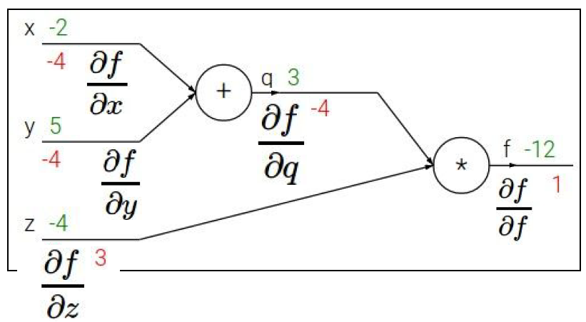 double dx = df * dq;如上所示的df = df/df = 1和上面所示的dq = df/dq = -4。因此:1(df) * -4(dq) = -4(dy).还是我完全错了?