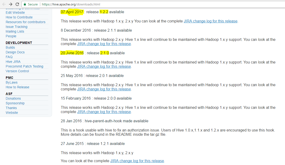 在2015年6月27日发布1.2.1之后,下一个版本是2016年2月15日的2.0版本,版本还在继续。再次在2017年4月7日,即最近再次Hive发布了1.2.2版本。我不明白为什么再次是1.2.2,而不是2.x.y。