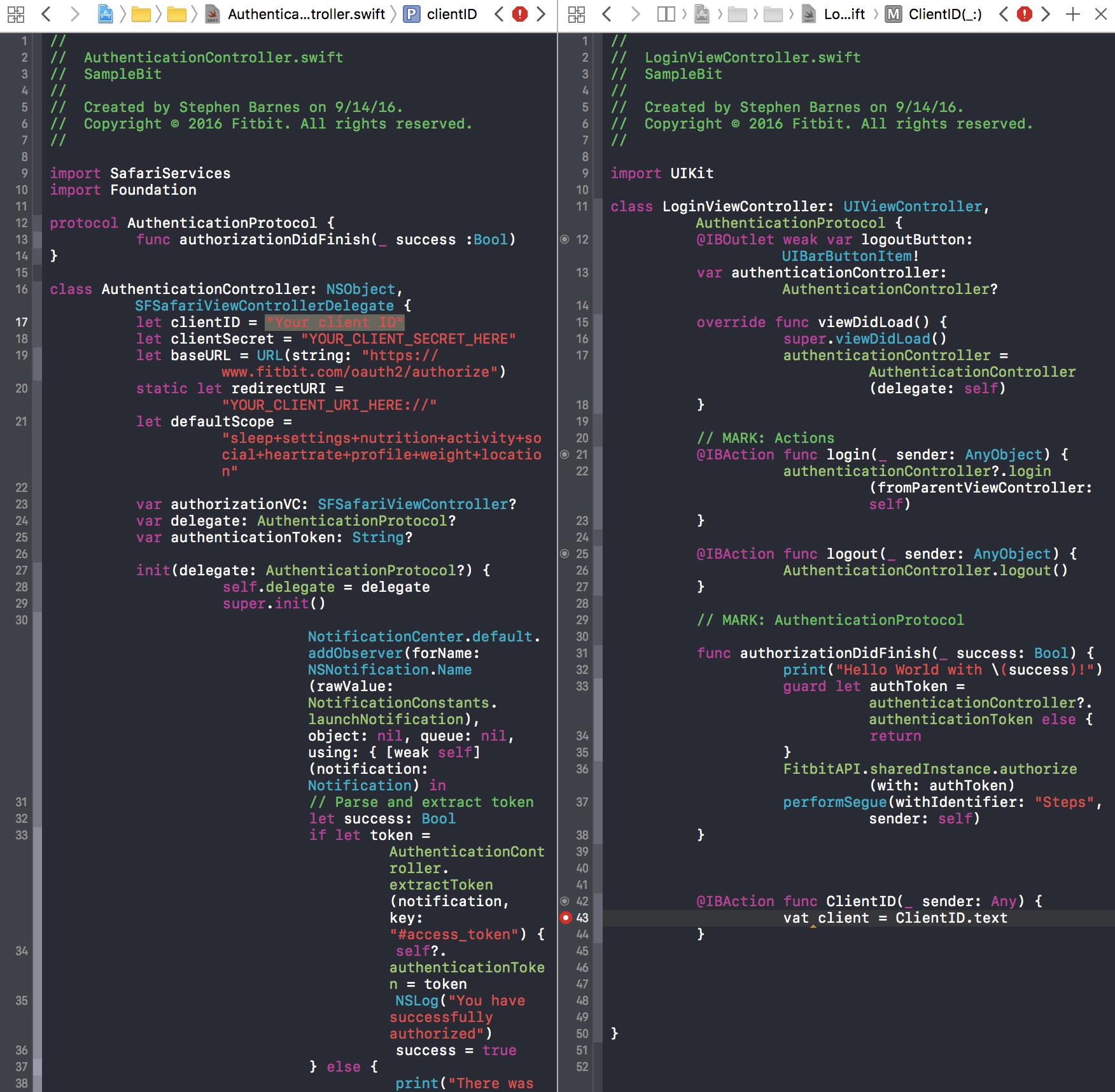 我已经附上了loginviewcontroller和FitBit身份验证控制器文件的完整屏幕截图。