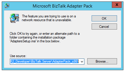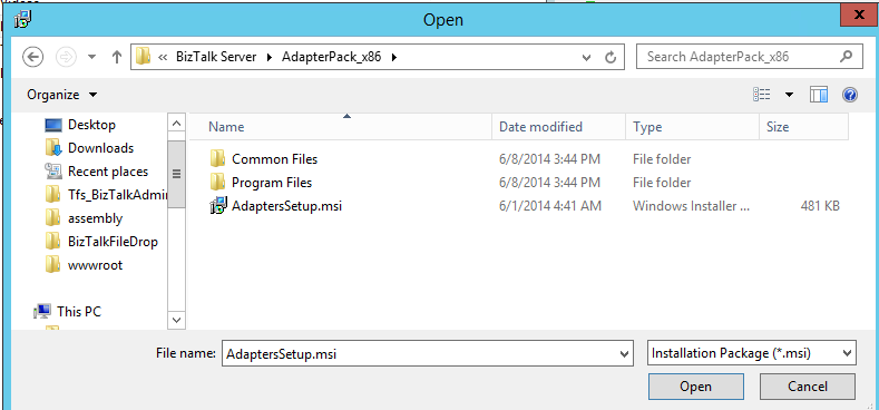 我已经从MSDN下载了BizTalk ISO并安装到本地服务器。所以我浏览到正确的路径。请注意选择对话框的“文件名:”文本框如何将文件名拼写为"aptersSetup.msi":