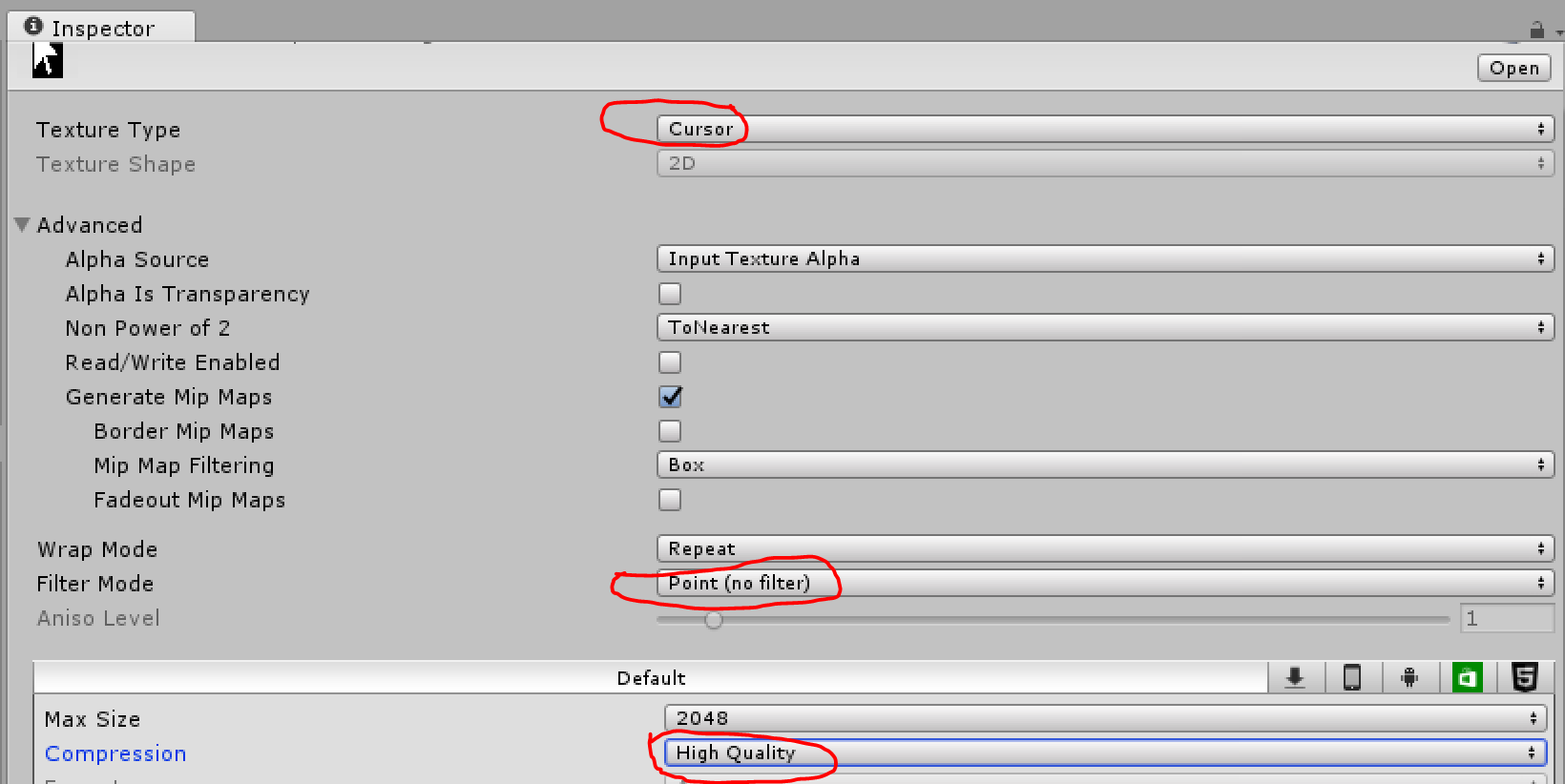 texture = itemImg.sprite.texture;显示您使用的Texture没有设置为“纹理类型”的游标。定义要使用的Texture,然后按照上面的步骤对纹理进行正确的设置。不要使用UI图像作为鼠标光标的来源。