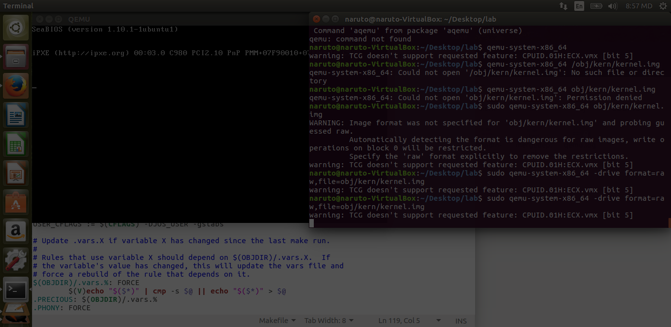 您不应该像以前那样用手动过程启动它(qemu-system-x86_64 ..)。此目标在实验室GNUmakefile中实现为