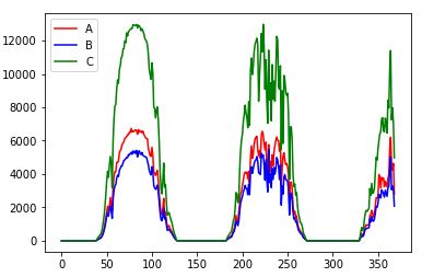 编辑:我可以使用几个太阳能电池板产生的电力。这些太阳能电池板是在空间上展开的,我想用它们作为“辐照度探测器”。了解过去几个地方的太阳照度,我希望找出信号之间的相关性,然后可以用来预测光照。不管一天的生产模式如何(如图像所示),我感兴趣的是我可以从一个班轮的过去中提取信息来预测另一个班轮的未来。