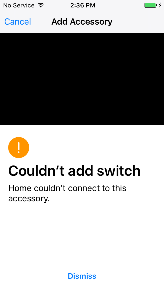 当我将附件添加到家庭/房间时,“输入设置代码”只显示半秒钟的,然后转向“无法添加XXX,Home无法中间连接该附件”,如下所示: