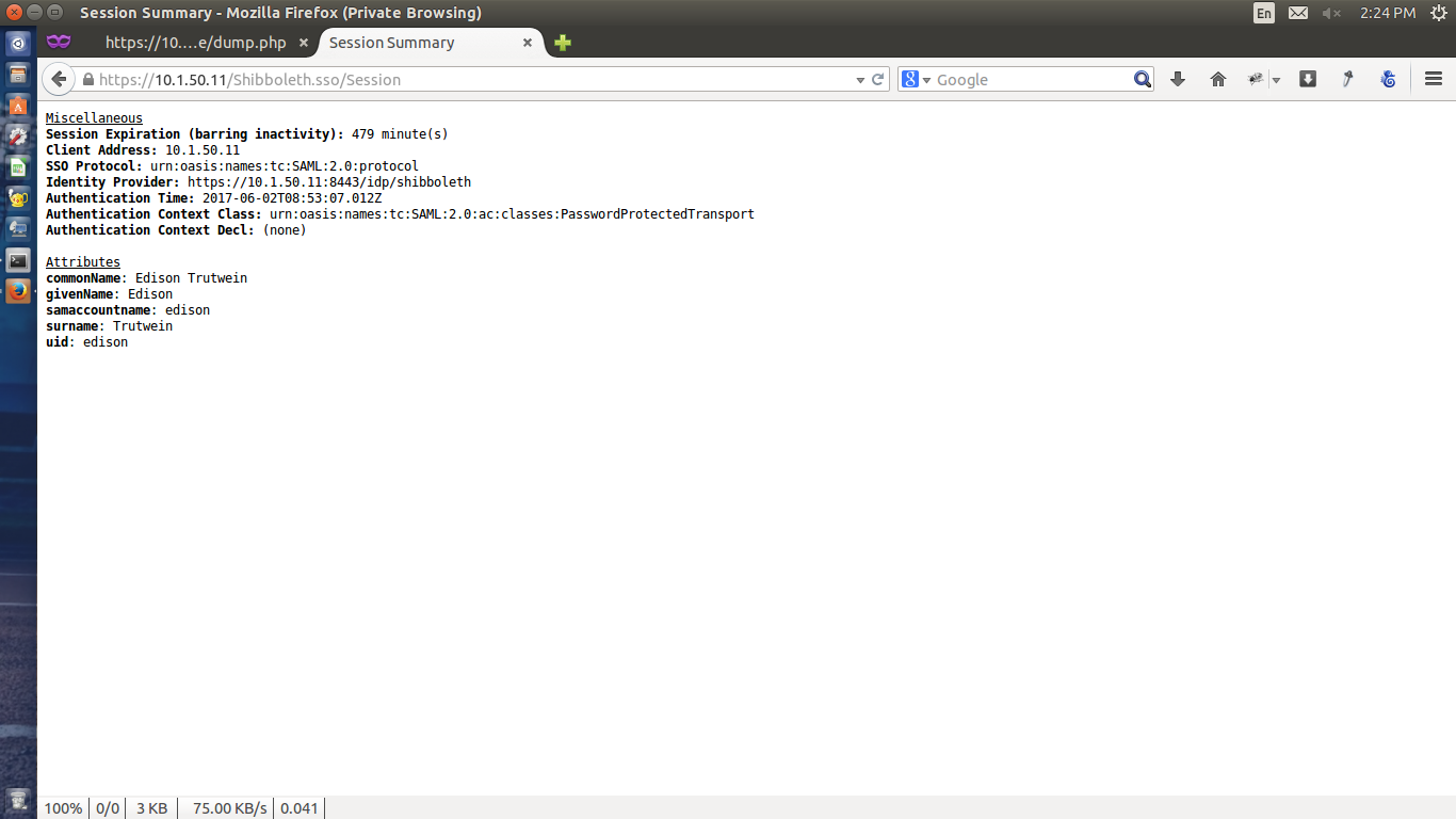 2017-06-01 19:06:14 INFO Shibboleth.SessionCache [1]: new session created: ID (_c699b07ff63f25bc28ef60abd9344a33) IdP (https://10.1.50.11:8443/idp/shibboleth) Protocol(urn:oasis:names:tc:SAML:2.0:protocol) Address (10.1.50.11)