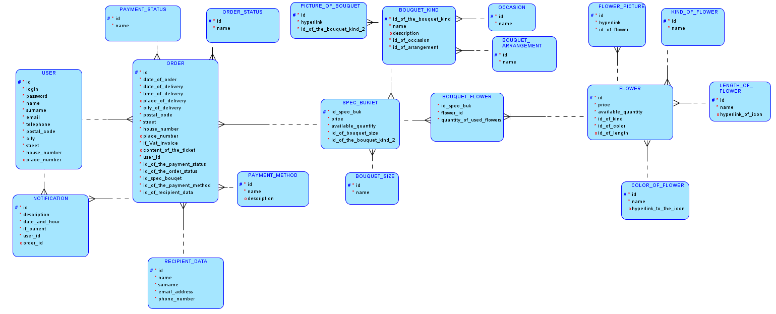 我正在做一个网络数据库应用--网上花店--一个人可以为那些对他们很重要的人订购花束,然后让快递员把花束送到这些人手中。我对数据库模式有问题。我不能用正确的方式连接实体--连接正在制造悖论,而且效率很低。这是数据库模式: