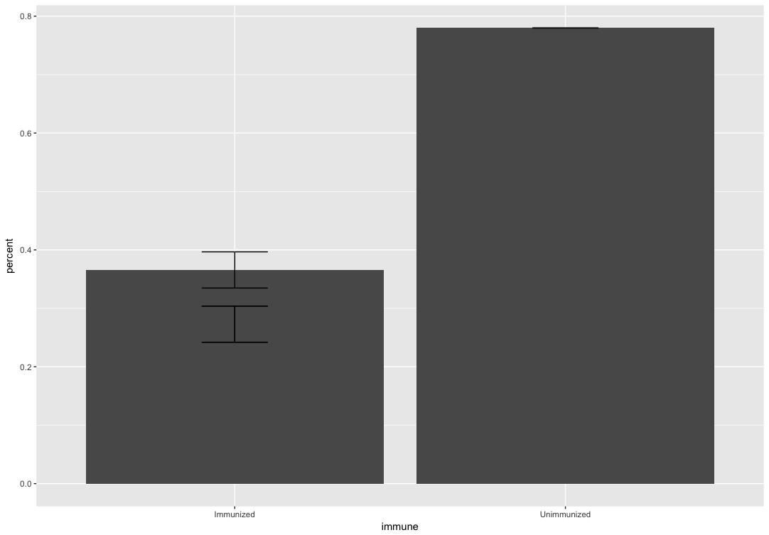 我正在创建一个条形图,画出他们是否被免疫的百分比。我还想把平均值的标准误差放在条形图中。