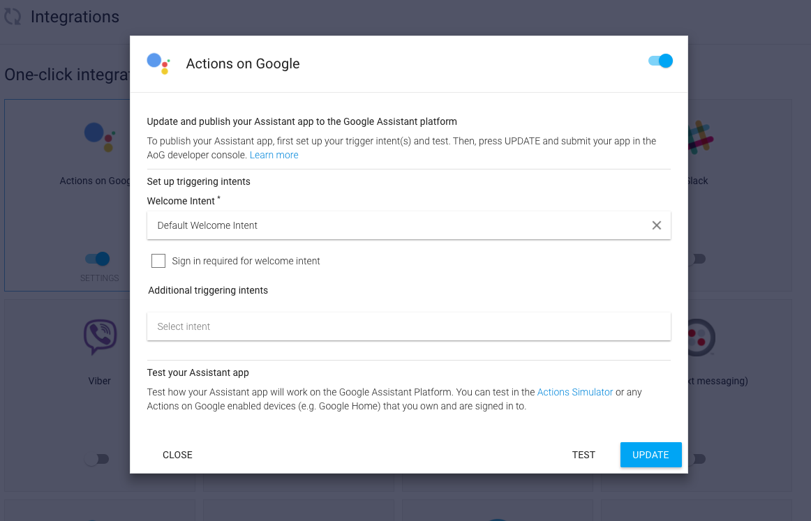 然而,我的整合谷歌行动的面板看上去并不像视频中显示的那样。我既没有看到授权也没有预览按钮。我也不能设置调用名称和TTS语音。