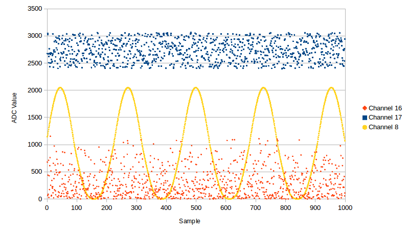 }如您所见,ADC通道16将模拟一个随机Vdd输入,ADC通道17将模拟一个随机温度输入,所有其他信道将跟随一个从0到2048的正弦波。下面是从所有三种模式返回的ADC值的图表: