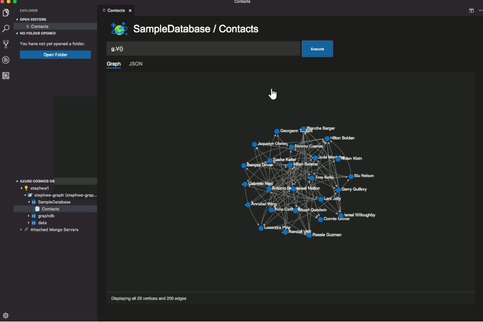 实际上,Azure Portal中有一个非常不错的用于图形可视化的web应用程序。在您的宇宙帐户内,只需单击QuickStart按钮,然后选择引导Gremlin旅游: