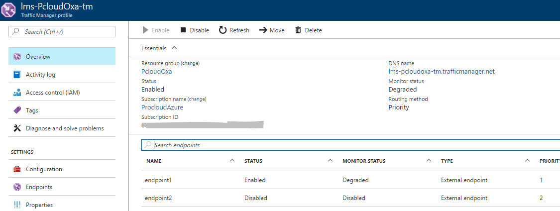 我在Azure女士上部署了一个交通经理。它有两个端点,其中一个是启用并联机的。奇怪的是,它变成了退化,因为我缩小了一些Vms,然后缩小到原来的大小,因为我怀疑他们可能是原因。我检查了所有的MS.support (当涉及到对流量管理器的故障排除时,这是不准确的),并运行调用-徒劳无功。这是我的交通经理: