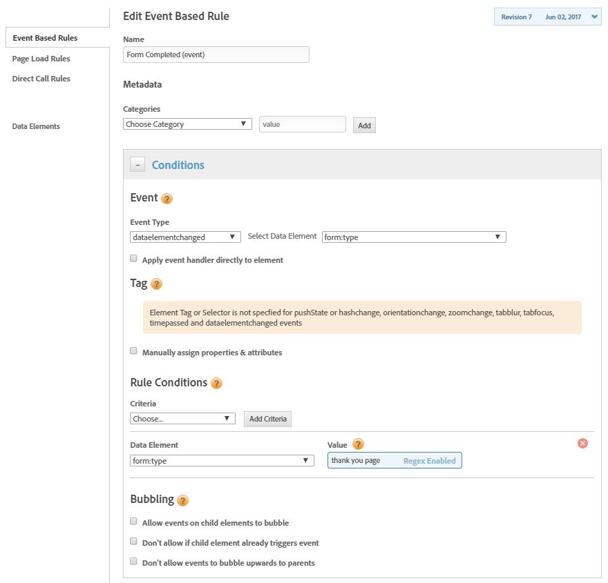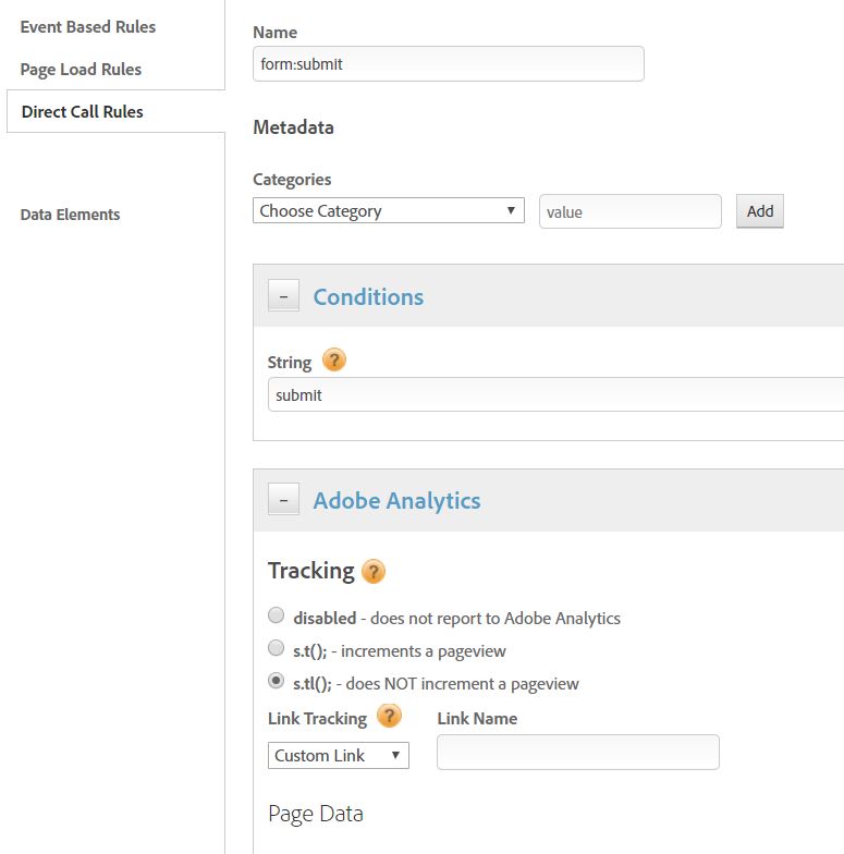 设置: My / Analytics工具在页面底部触发,我使用直接调用规则触发_satellite.track(“表单提交”);在表单按钮上使用表单提交,并使用一个基于事件的规则,该规则查找具有字符串值“感谢页面”的数据层对象,该规则触发表单完整。