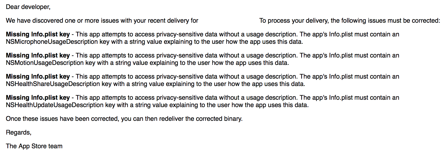 作为连接框架的正常过程,它应该工作得很好。当我将应用程序提交给苹果时,我最终收到了苹果开发人员的这封电子邮件,我认为问题在于ResearchKit info.plist本身。如果有人有同样的问题,分享如何解决这个问题将是很好的。我的应用程序没有向用户询问NSMotionUsageDescription、NSMicrophoneUsageDescription、NSHealthUpdateUsageDescription和NSHealthShareUsageDescription。我认为这是ResearchKit的工作。