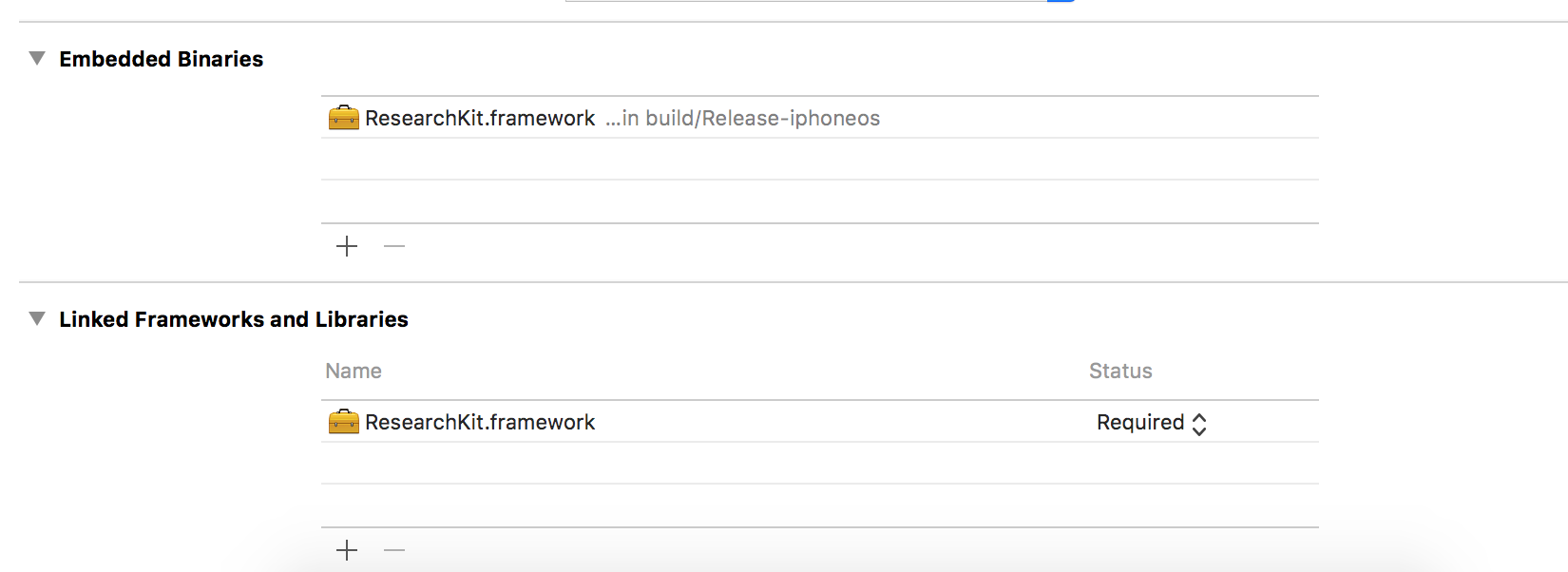 我正在用苹果公司的ResearchKit做一个项目,我的应用程序正在使用它作为一个框架。我已经将它导入到当前项目的同一个文件夹中,所有构建和运行都很好。具体来说,我已经将框架添加到了3个位置。