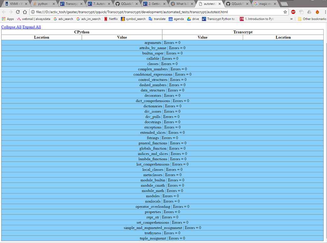 自动测试在CPython和Transcrypt下运行。当将结果加载到浏览器中时,会自动验证结果是相同的。这被称为“背对背测试”,对check函数的调用就是这样做的。因此,Transcrypt的正确行为被简单地(“操作”)定义为CPython行为。Python和大多数脚本语言一样,缺乏一个正式的语义规范。