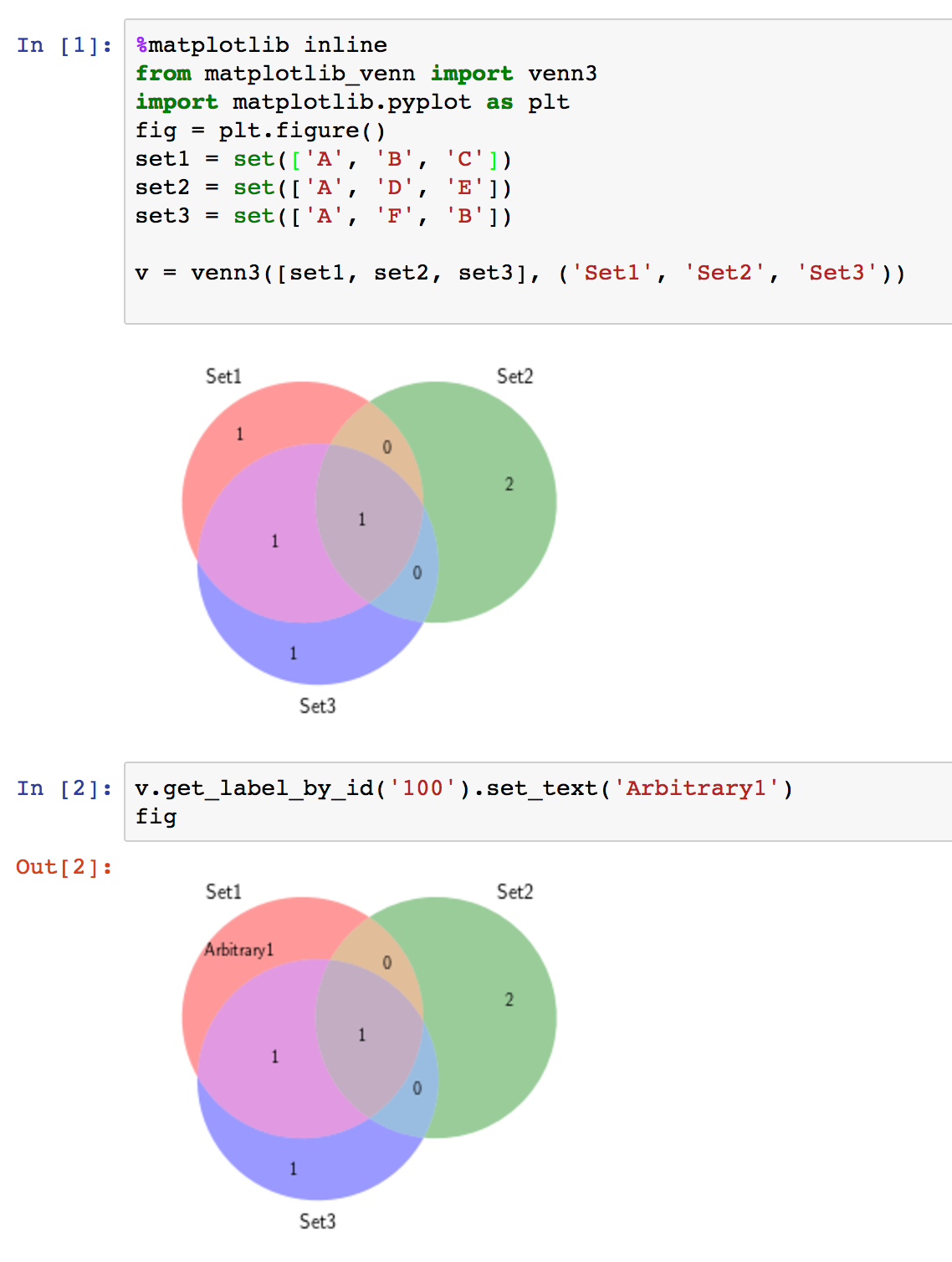 v = venn3([set1, set2, set3], ('Set1', 'Set2', 'Set3'))给出内嵌的Venn图。然后,我继续更改标签。