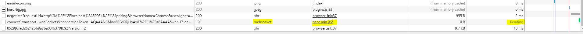 我在html页面中包含了pace.js,以显示默认进度栏。重新加载页面后,进度栏将保持超过2-3分钟。当我查看developer工具时,我发现pace.min.js正在发出'websocket‘类型的请求。