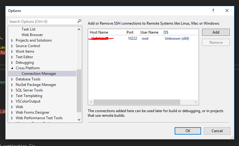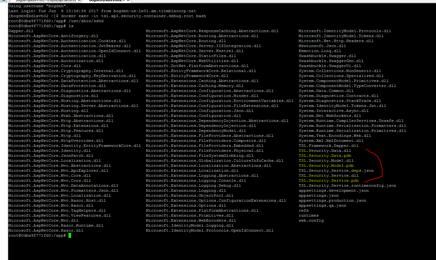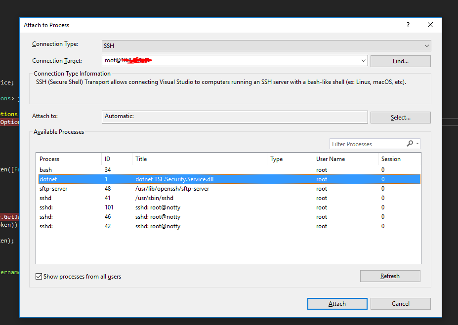 cd ~/repos/api.security // git存储库上git pull //为.NET核心项目从git中提取最新代码dotnet restoredotnet publish //没有其他args与.pdbs一起发布docker build -t tsl.api.security.image.debug -f Docker.debug .docker run -d -p 8080:5000 -p 10222:22 --name=tsl.api.security.container.debug -t tsl.api.security.image.debug //运行并将端口5000上的容器中的.NET核心Webapi映射到主机端口8080,将容器中的ssh映射为端口22,映射到主机上的端口10222docker exec -it tsl.api.security.container.debug bash //终端从主机进入正在运行的容器/usr/sbin/sshd //启动sshd好吧,现在容器已经准备好使用Visual 2017在我的机器上使用Visual 2017进行远程调试了: