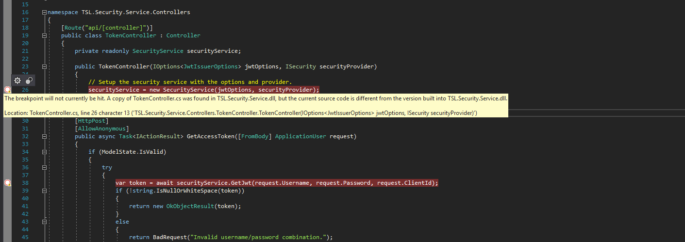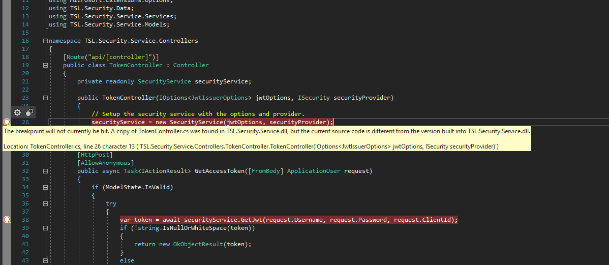 "The breakpoint will not currently be hit. A copy of TokenController.cs was found in TSL.Security.Service.dll, but the current source code is different from the version built into the TSL.Security.Service.dll."