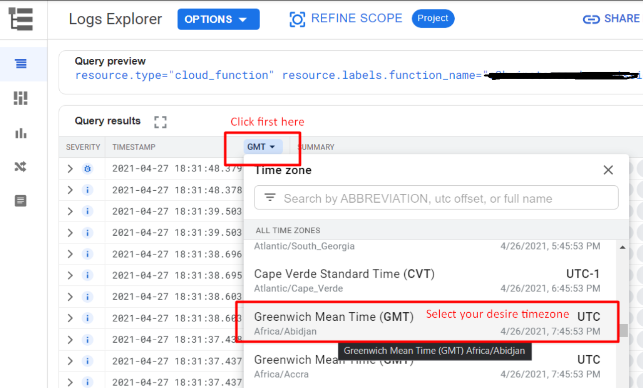 如何更改Google平台日志中显示时间的时区?它目前正在用CEST时间显示日志,我希望看到UTC时间(这是它一直使用的服务器)。
