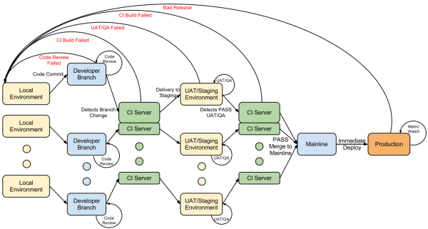 这意味着,我让CI服务器自动创建一个发布分支,并在生产环境的暂存槽上重新运行所有测试。如果失败,它将报告并删除发布分支,否则将创建发布点,触发网络交换并将其合并到主服务器。