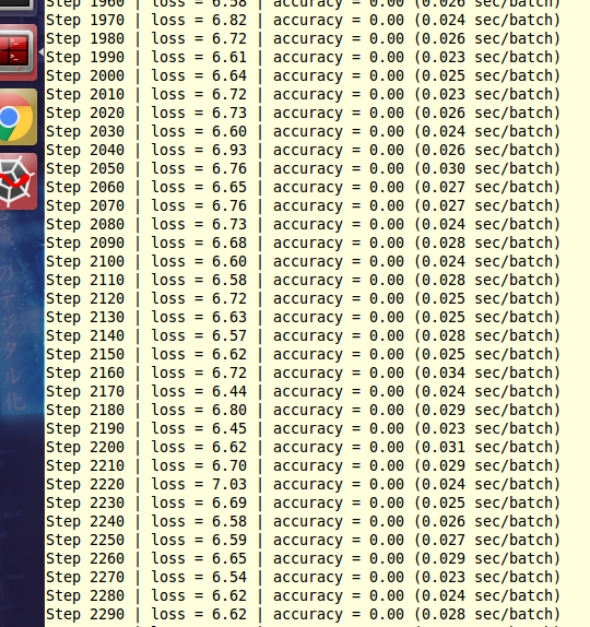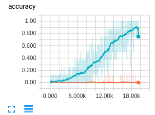 在橙色是准确性和损失(拉伸板和终端)时,程序显示根本没有学习。我被在术语中显示的损失所愚弄。正如@hars为检查准确性和损失日志所指出的,我发现张力板中的损失在第一步就出现了差异。通过将学习速率从0,01改为0,001,散度消失了,正如你在青色中所看到的那样,模型正在学习(在1分钟内超过了一小部分图像)。