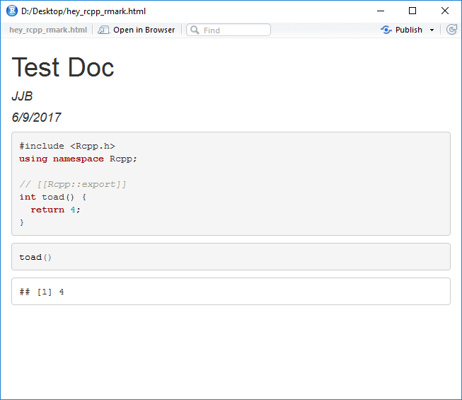 为了实现相同的结果,并真正实现识字编程,每个部分都应该嵌入到单独的代码块中。也就是说,您必须创建一个Rcpp代码块(最好启用缓存)和一个包含实际函数调用的R代码块。