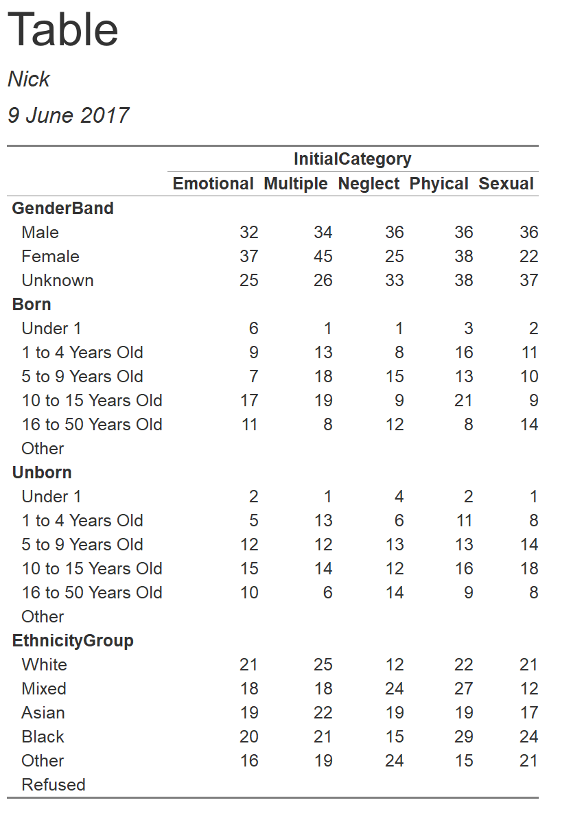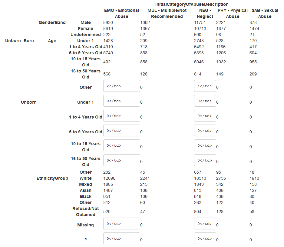 Age = recode(ChildAge31March, 0 ~ 1, 1 %thru% 4 ~ 2, 5 %thru% 9 ~ 3, 10 %thru% 15 ~ 4, 16 %thru% 50 ~ 5, other ~ 6) val_lab(Age) = autonum( "Under 1 1 to 4 Years Old 5 to 9 Years Old 10 to 15 Years Old 16 to 50 Years Old Other")val_lab(Unborn) = num_lab( "0 Born 1 Unborn")val_lab(GenderBand) = autonum( "Male Female Unknown")val_lab(EthnicityGroup) = autonum( "White Mixed Asian Black Other Refused")val_lab(InitialCategory) = autonum( "Emotional Multiple Neglect Phyical Sexual" )})