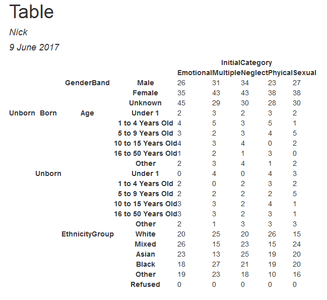 levels = c(1,2,3,4,5), labels = c("Emotional", "Multiple", "Neglect", "Phyical", "Sexual"))表<-表格(GenderBand+(未出生*年龄)+ EthnicityGroup ~ InitialCategory,data=data)