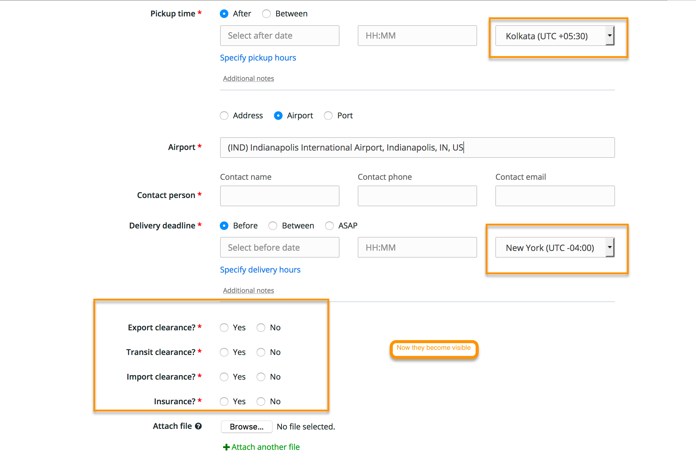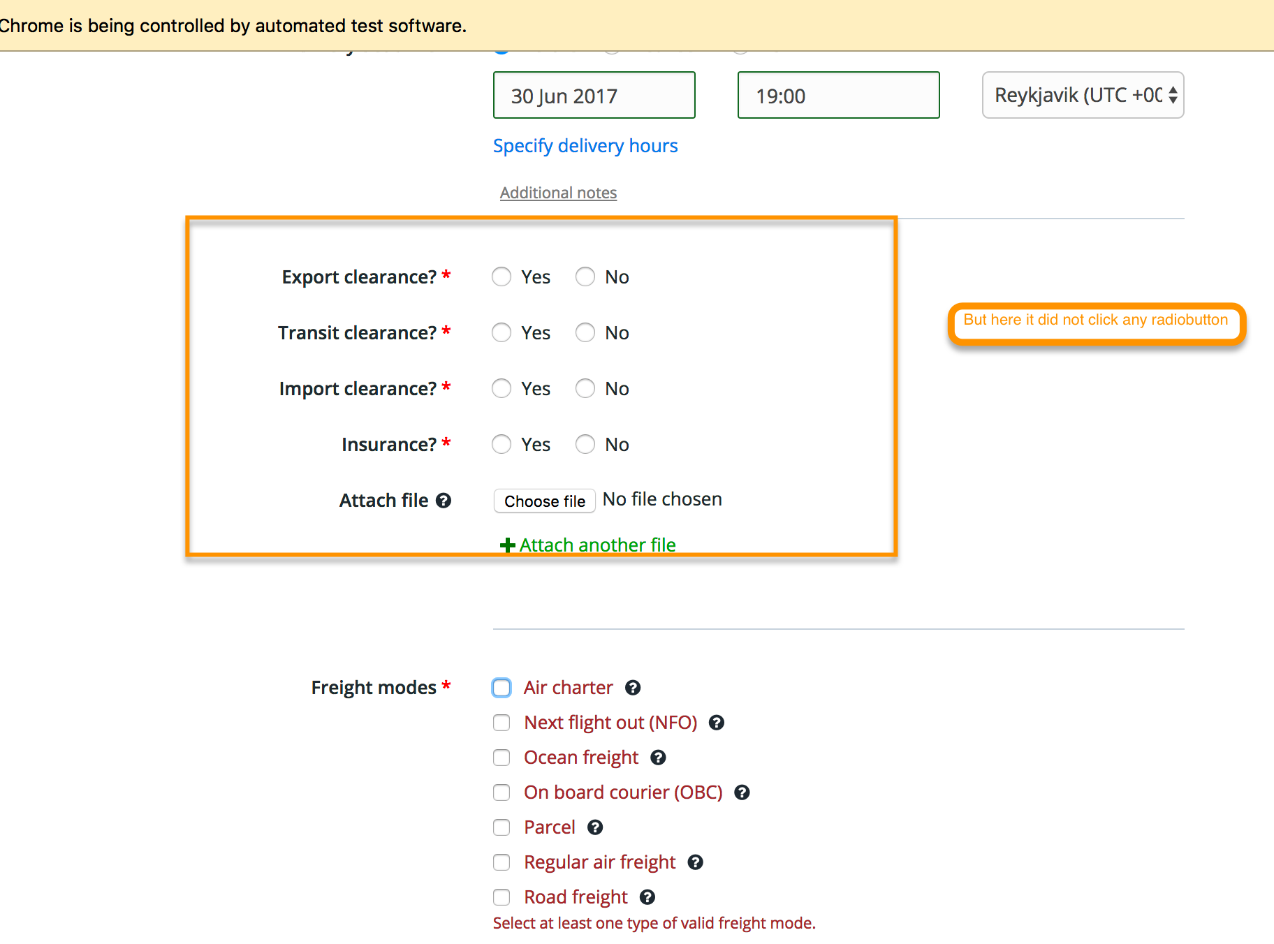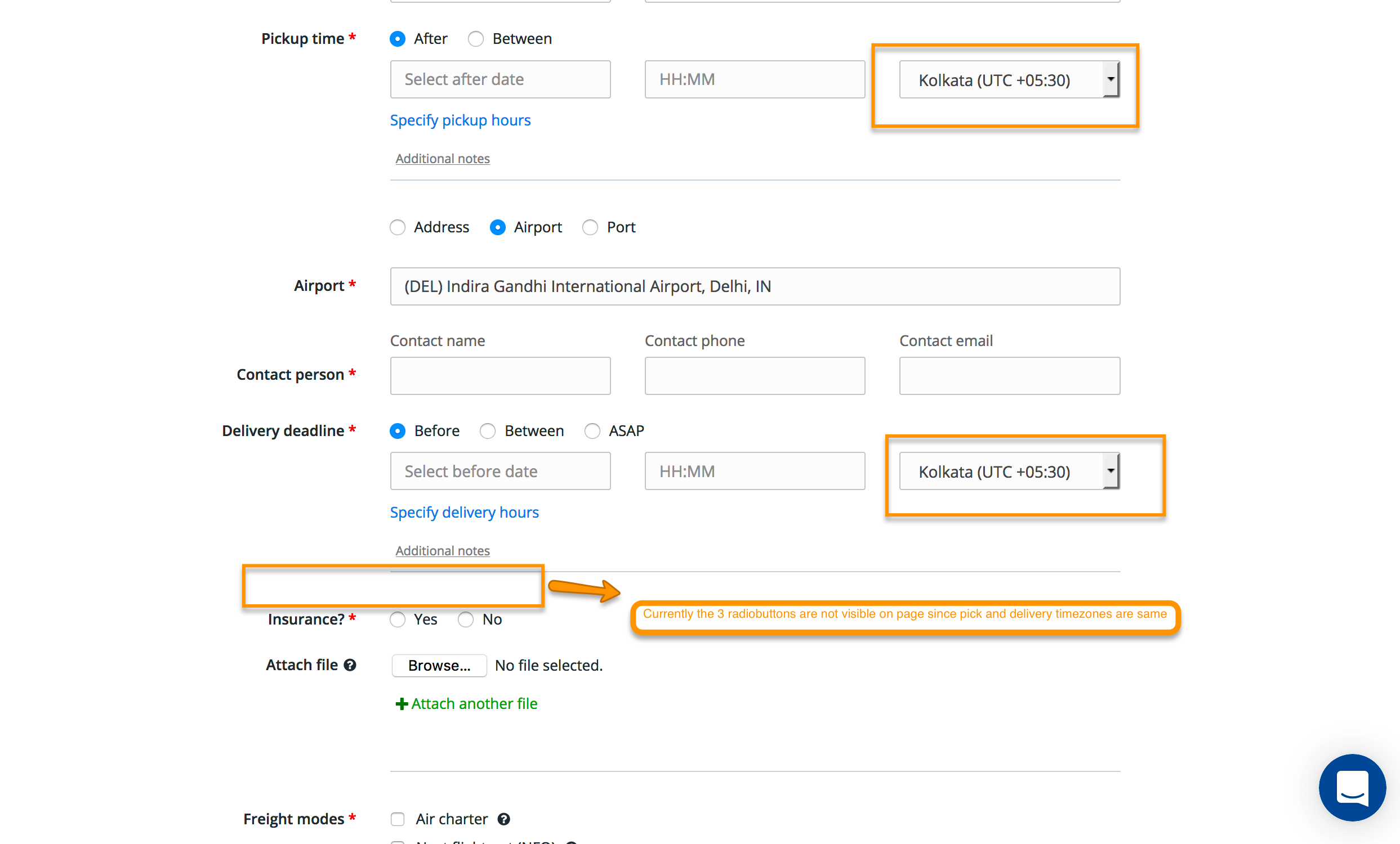 实际上,无线电按钮总是在DOM中,但根据地址字段,它们在页面上是可见的,因此,如下面所示,如果拾取和发送时区相同,则页面上看不到无线电按钮:
