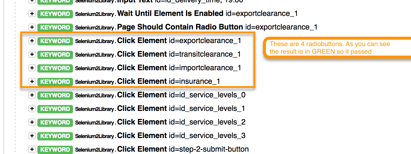 现在,在我的脚本中,我尝试将所有的无线电按钮设置为“否”,所以当我运行它时,脚本会通过,但在实际情况下,无线电按钮是不动的。结果如下所示: