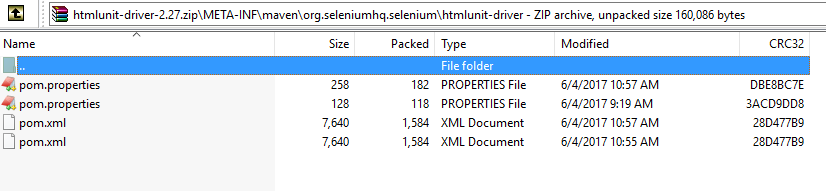 进一步研究后,我发现htmlunit-driver-2.27.jar文件包含两个pom.properties和pom.xml。