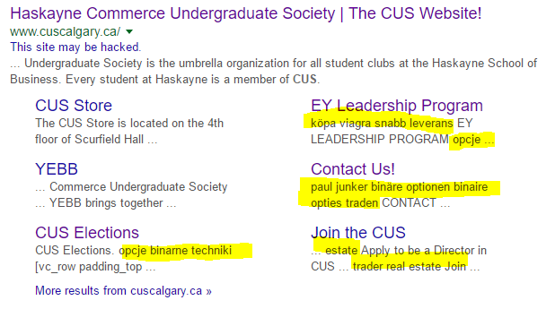 我是www.cuscalgary.ca的网站经理。如果你在谷歌搜索"cus calgary“,我的网站上有几个链接,在链接描述(见下面的截图)中似乎有奇怪的荷兰字符串,比如”k pa viagra snabb利用“。此外,我得到了臭名昭著的“这个网站可能被黑”的信息,就在我的网站的主要链接在谷歌。