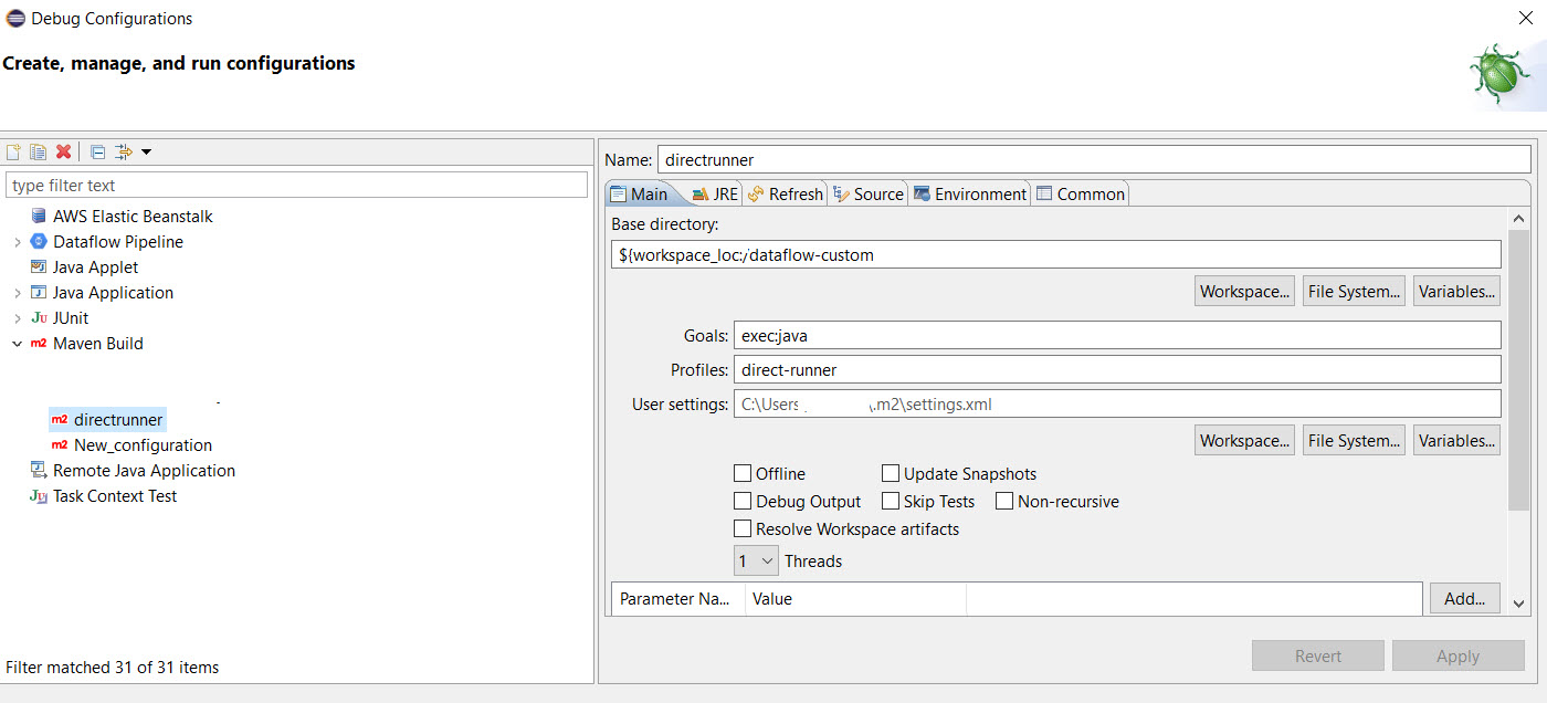 我希望在eclipse中使用直接转轮运行管道,并在DoFn函数和调试执行中放置一个断点。我尝试通过以下步骤设置直接运行程序: