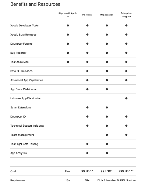 苹果开发者企业计划。如果您的组织希望创建专门为您组织的员工设计和分发的专有应用程序,请注册。成员包括访问beta OS版本、高级应用程序功能以及为整个开发团队开发、测试和分发应用程序所需的工具。公司和教育机构必须在注册过程中提供注册到其法律实体的during号码(免费提供)。
