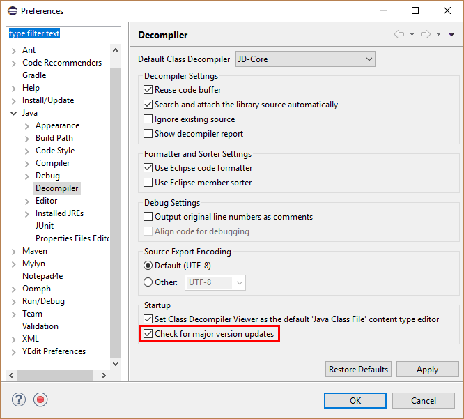 您可以通过窗口-> Preferences -> Decompiler禁用自动更新检查。在“启动”部分,取消选中“检查主要版本更新”框,如下所示: